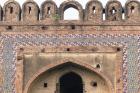Subject: View of first floor projected left balcony and semi-domed alcove with glazed tile work on the south facade of the Southern Gateway (Delhi Darwaza)
