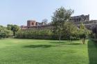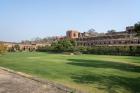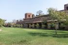 Terrace above the sarai cells with a battlemented parapet, and the Hiran Minar visible in the background