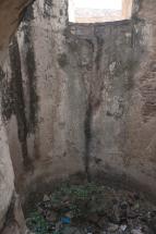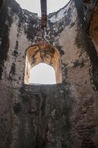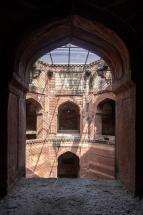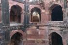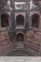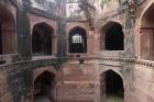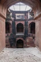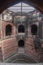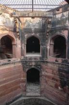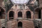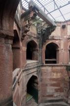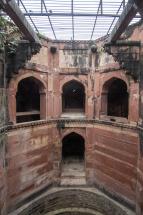 Octagonal shaft of the stepwell with arched openings on the two levels and overhead brackets
