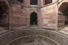 Octagonal shaft of the stepwell with arched openings on the second level and overhead brackets