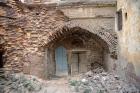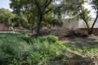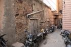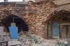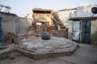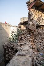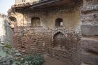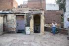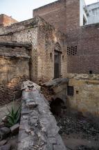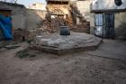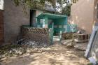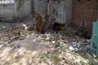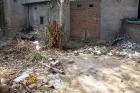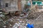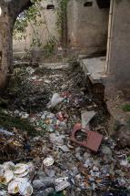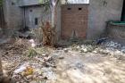 Stairway (buried under garbage) leading down to baoli, tomb in the background