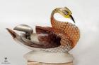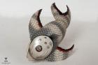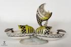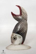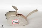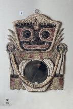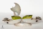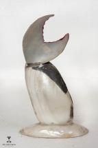 Subject: Seashell Showpiece. A decorative item of a pair of birds painted over a shell. Seashell craft has been a prominent art form in Puri and Konark since seashells are easily available next to the coast line. There are many varieties of shells with a range of patterns, textures and shapes. The shells are used for making decorative and utilitarian items. The pieces also illustrate various themes from the life of Lord Jagannatha. Back view of the object.