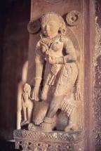 Subject: Mandapa, Pillar: Female figure with attendant; Built to commemorate of their son Maharaja Kumar Jagat Singhji (d. 1599)