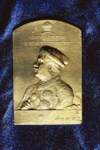 Subject: Silver-plated bronze commemorative plaque given for excellence. [Portrait of Maharaja Sayajirao Gaekwar III (1881-1939)]
