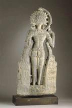 Subject: Somaskanda: Somaskanda is the term used to describe a composition that depicts Shiva and his consort Parvati seated on a throne with their infant son Skanda between them. The four-armed Shiva holds a battle-ax and a deer in his upper hands. His lower right hand is raised in abhayamudra (the gesture of fearlessness). Parvati sits turned towards Shiva. Her left hand bestows grace using the varada-mudra. This subject was especially popular in shrines of the Pallava period (300-850 CE), and continued to be so in the Chola period (850-1267 CE). Both figures have a projecting disc (siras cakra) at the back of their heads. This was used for hanging garlands during pujas (worship) and processions. Four rings at the lower corners of the pedestal allowed the sculpture to be secured to a platform in order to be carried in processions. The Saiva Siddhanta system as developed in the Tamil land lays great emphasis on the concept of Ammai and Appan (i.e., Mother and Father) for Shiva and Parvati. A large number of Somaskanda images exist, in apart because a range of Agamic texts specify that if a temple does not possess the exact image required for a specific ritual procession, Somaskanda bronze can be used as a substitute. This is the back view of the sculpted image.