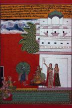 Raga sung during rainy season; megha means cloud; peacocks are symbolic of passion; Meghamalhara Raga