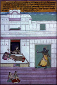 Upper left portion, lady at window with snake [Ragini with snake (Saveri Ragini ?)]