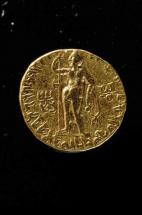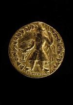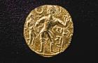 Subject: Kidara was apparently related to Peroz, whose names appear on some Gandharan coins; he was probably of Hunnish origin, not a Kushan. He took on Kushan regalia as their successor in Gandhara.; Standing King sacrificing with right hand and holding trident in left. [Gold Dinar, Obverse]