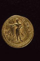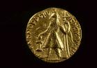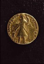 Subject: Lunar deity Mao standing, facing left, crescent behind shoulders, holding long standard tipped with ball and ribbons; Kushan symbol to right [Gold Dinar, Reverse]