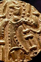 Subject: King standing, head turned left, helmeted and holding a battle ax in right hand, his left hand akimbo on his hip. At left are a smaller figure wearing military garb and a crescent tipped standard. [Gold Dinar, Battle Ax type, Obverse]