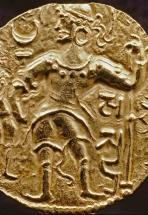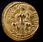 Subject: Note long side and mole on forehead. The bust emerging from the clouds probably represents a deification of kingship; Half-length bust of king facing left, holding club and ankusa, over clouds [Gold Dinar, Obverse]