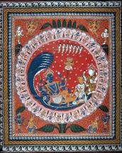 Subject: Putana's Cremation - Upper right portion, Krishna and Yashoda; The first demon to threaten the infant Krishna was the ogress, Putana in the form of a young girl. Krishna sucks her life out, and is unaffected by the poison on her breasts.