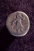 Subject: Lunar god Mao standing, facing left, with lunar crescent behind shoulders, holding orb-tipped staff in left hand; right hand in characteristic two-finger gesture [Gold Dinar, Reverse]