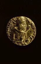 Subject: Maaseno is a deity of war.; Maaseno standing, facing, holding eagle-tipped scepter in right hand, a sword in his left hand is held in front of his stomach [Gold Dinar, Reverse]