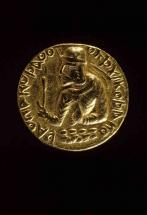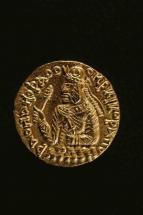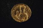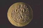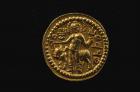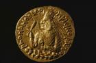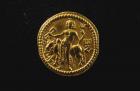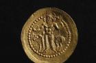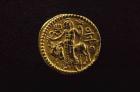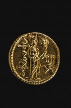 Subject: Cornucopias and bow represent a plentiful harvest and successful hunt, respectively ; Ardoxsho, goddess of plenty and fortune, standing facing right, holding cornucopias and bow [Gold Dinar, Reverse]