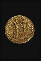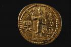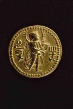 Subject: Kidara was apparently related to Peroz, whose names appear on some Gandharan coins; he was probably of Hunnish origin, not a Kushan. He took on Kushan regalia as their successor in Gandhara.; Standing King sacrificing with right hand and holding trident in left. The name Kidara appears below the King's arm, Kushana at far right, with an additional word generally read as kapa or Kapan to the left of his feet. [Gold Dinar, Obverse]
