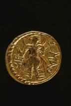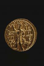 Subject: Standing, Four-armed Siva, facing left, holding drum, vajra, vase, ankusa, trident-tipped staff and an antelope by the horns; wearing necklace of beads or talismans [Gold Dinar, Reverse]