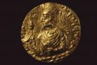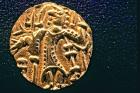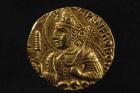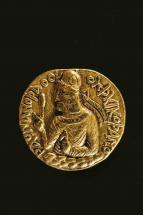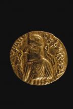 Subject: One of the finest Kushan portraits ever made.; Half-length bust of ruler facing left, holding mace in right hand, tasseled lance in left hand; he wears a pointed, conical, highly ornamented headdress. [Gold Dinar, Obverse]